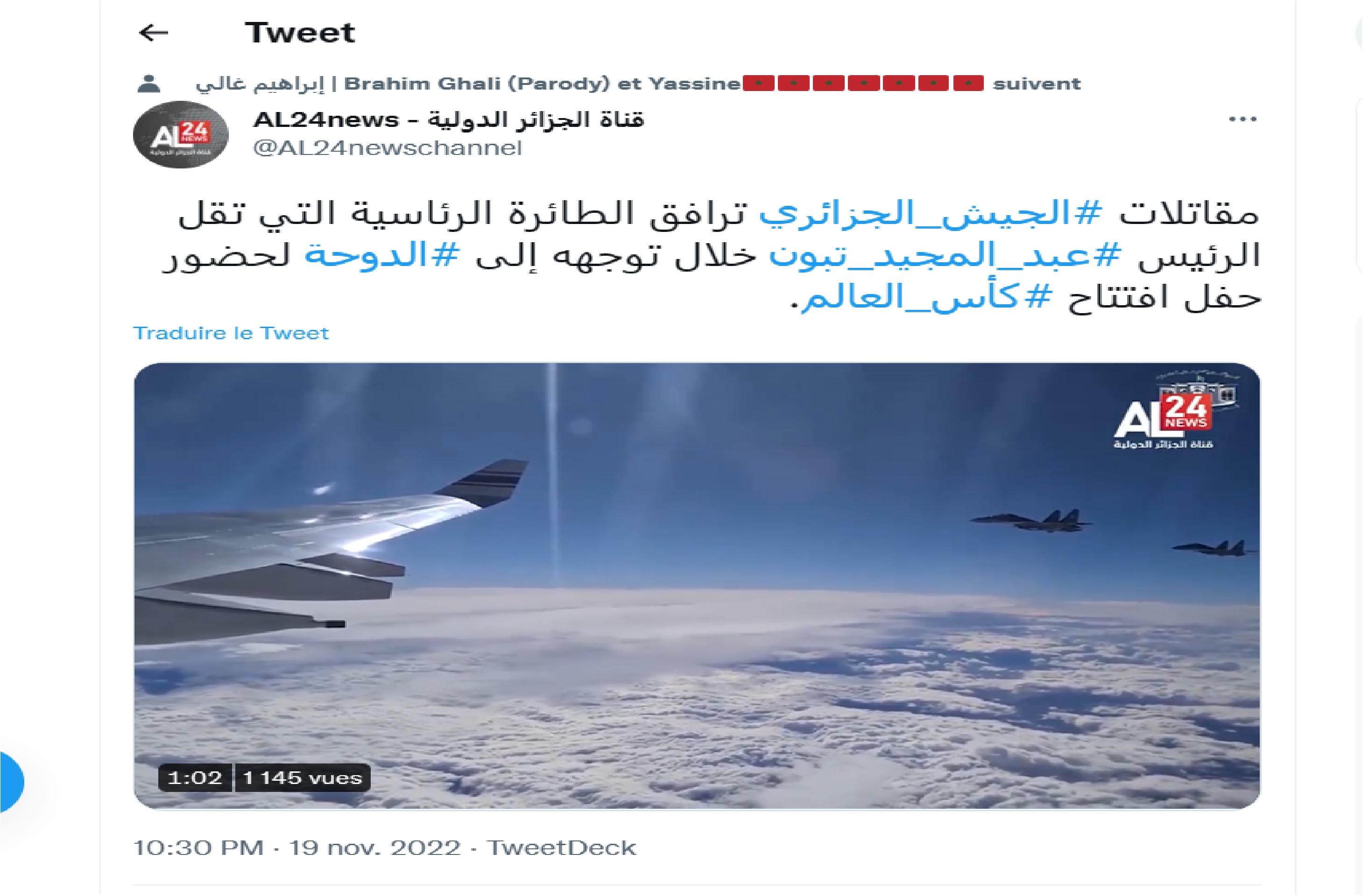 ولعل الجميع قد تابع القصاصات التي تنقلها الصحافة الرسمية الجزائرية.. حول مرافقة الطائرات العسكرية المقاتلة لزين السمية في جميع تحركاته.. حتى قال البعض بأن المقاتلات الحربية يجب أن ترافق الرئيس تبون حتى في نشاطاته الرياضية وتحركاته اليومية.