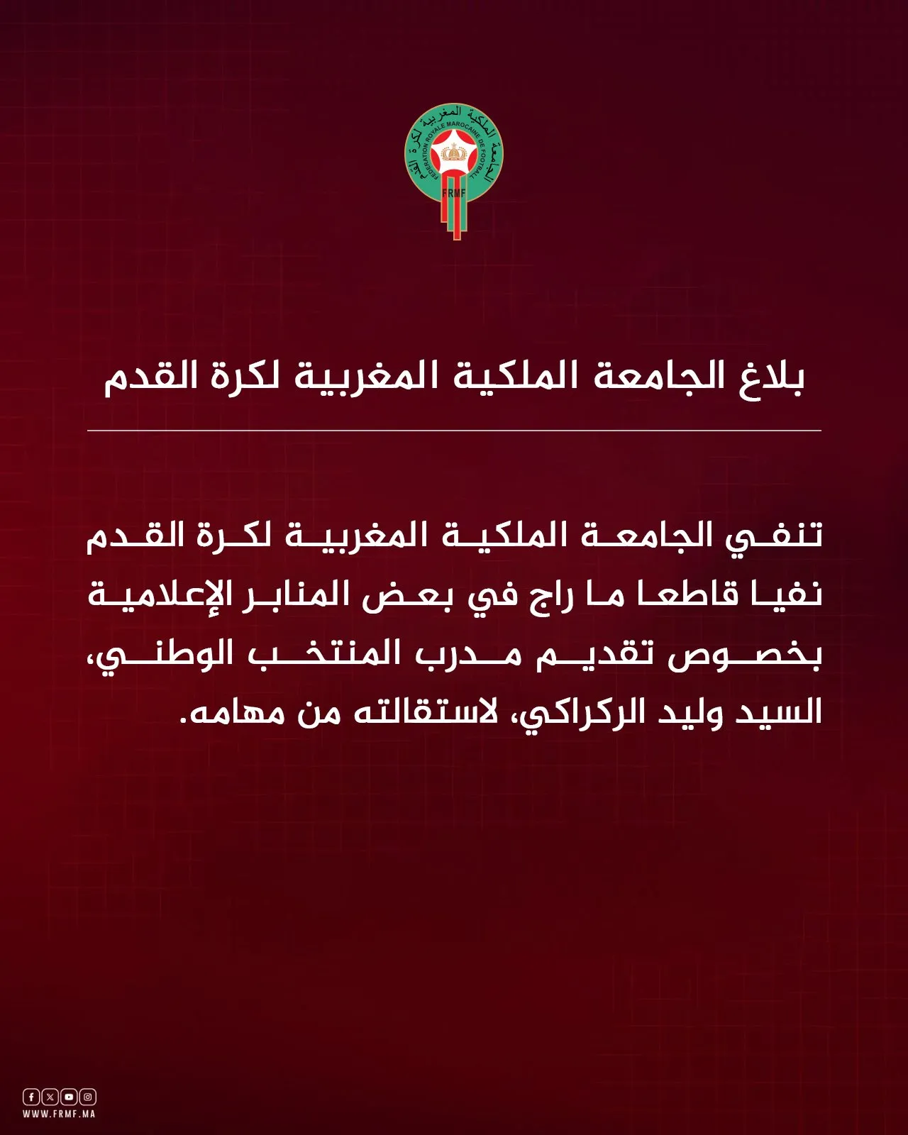 نفت الجامعة الملكية المغربية لكرة القدم بشكل قاطع كل الأنباء التي تداولتها منابر إعلامية حول تقديم وليد الركراكي استقالته من تدريب المنتخب المغربي. وأكدت جامعة الكرة المغربية في بلاغ رسمي أن هذه الأخبار لا أساس لها من الصحة ومجرد شائعات عارية عن الحقيقة. ومن هذا المنطلق، دعت الجامعة كافة وسائل الإعلام إلى توخي الدقة والاعتماد حصرا على المصادر الرسمية لنشر أخبار “الأسود”.