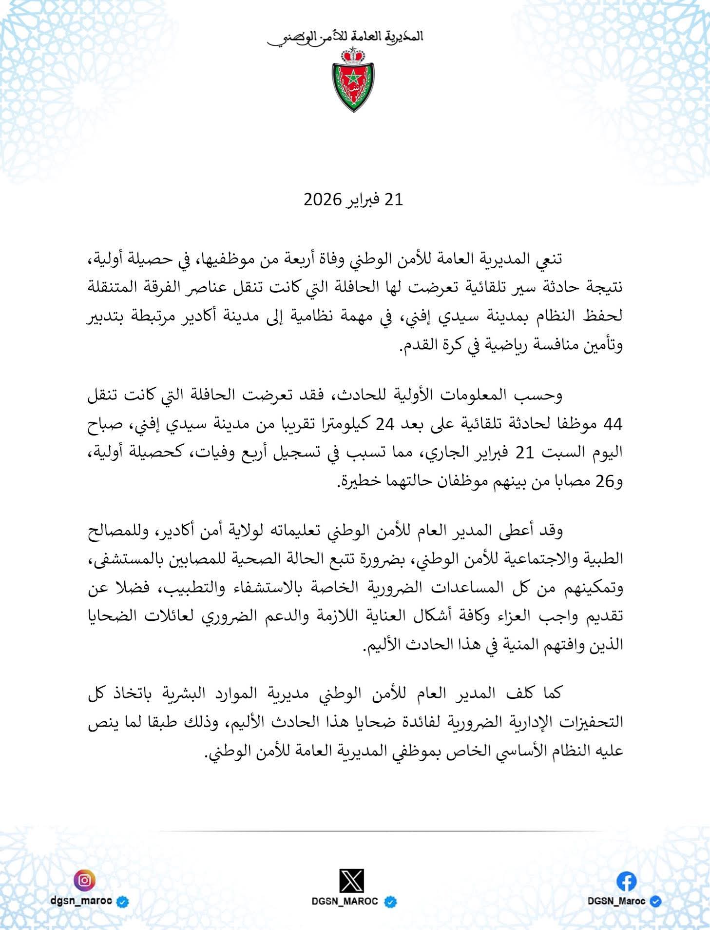 حوّل حادث حافلة الأمن الذي وقع صباح السبت قرب سيدي إفني مهمة اعتيادية لتأمين مباراة في كرة القدم إلى فاجعة إنسانية أليمة.. بعدما أسفر، في حصيلة أولية، عن واستشهاد أربعة من عناصر الأمن الوطني وإصابة 26 آخرين، من بينهم حالتان في وضع صحي حرج.