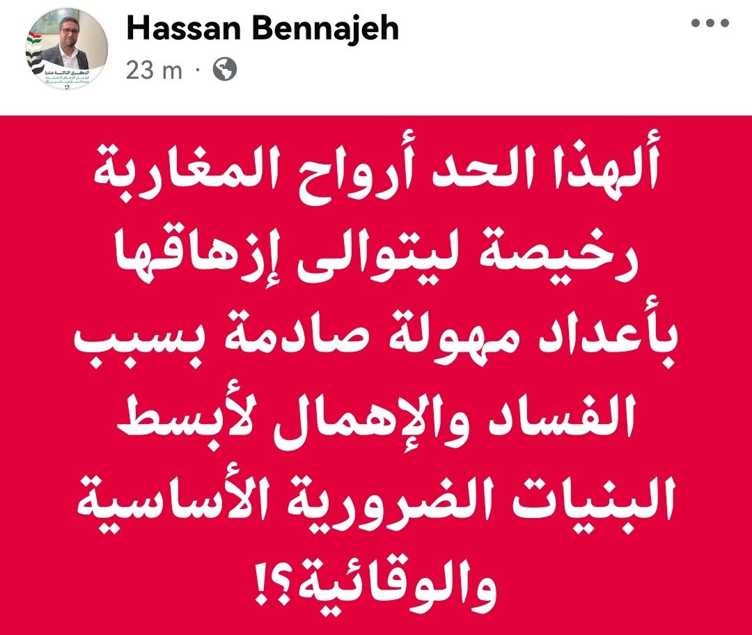 من بين هؤلاء، يبرز حسن بناجح ، المتحدث باسم جماعة العدل والإحسان، الذي لم يجد أفضل من هذه اللحظة الحزينة ليطلق تدوينته المسمومة: “ألهذا الحد أرواح المغاربة رخيصة ليتوالى إزهاقها بأعداد مهولة صادمة بسبب الفساد والإهمال لأبسط البنيات الضرورية الأساسية والوقائية؟!”