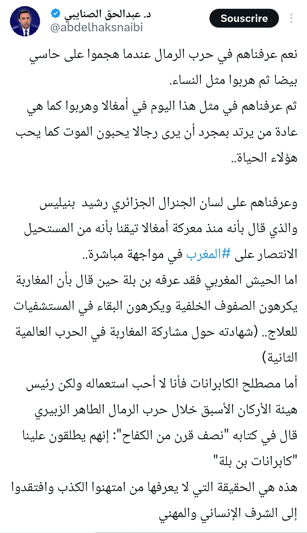 واستعاد الخبير الاستراتيجي المغربي ذكرى معركة “أمغالا” الخالدة التي شهدت انكسارا عسكريا جزائريا صريحا. ولم يكتفِ الصنايبي بالسرد، بل استدل بشهادات رسمية من قلب المؤسسة العسكرية الجزائرية نفسها. حيث استشهد باعتراف الجنرال رشيد بنيليس بصعوبة مواجهة الجيش الملكي المغربي في الميدان. كما أحال القراء على كتاب “نصف قرن من الكفاح” لرئيس أركان الجيش الجزائري الأسبق الطاهر الزبيري. وأكد الصنايبي أن مصطلح “الكابرانات” نبع من صلب الصراعات الداخلية للمؤسسة الجزائرية ولم يبتدعه الخارج. وهكذا تحول النقاش من مجرد تدوينة عاطفية إلى درس تاريخي رصين ألهم المتابعين.
