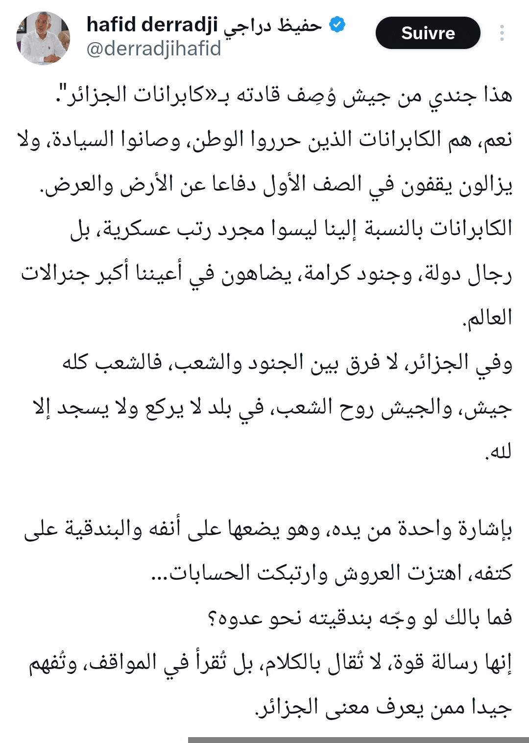 وجه د عبد الحق الصنايبي مدفعيته نحو الحذاء الإعلامي للعسكر الجزائري حفيظ الدراجي.. وهو ما عرى على زيف البروباغندا التي يحاول الإعلام الجزائري تسويقها. فقد حاول الدراجي عبر منصة “إكس” رسم صورة مثالية لقادة بلاده العسكريين بكلمات حماسية. لكن رد الدكتور عبد الحق الصنايبي جاء صاعقا ونبش في دفاتر الماضي القريب الموثقة.